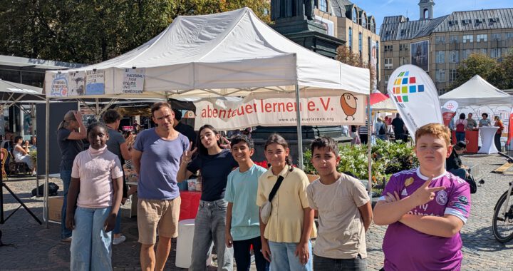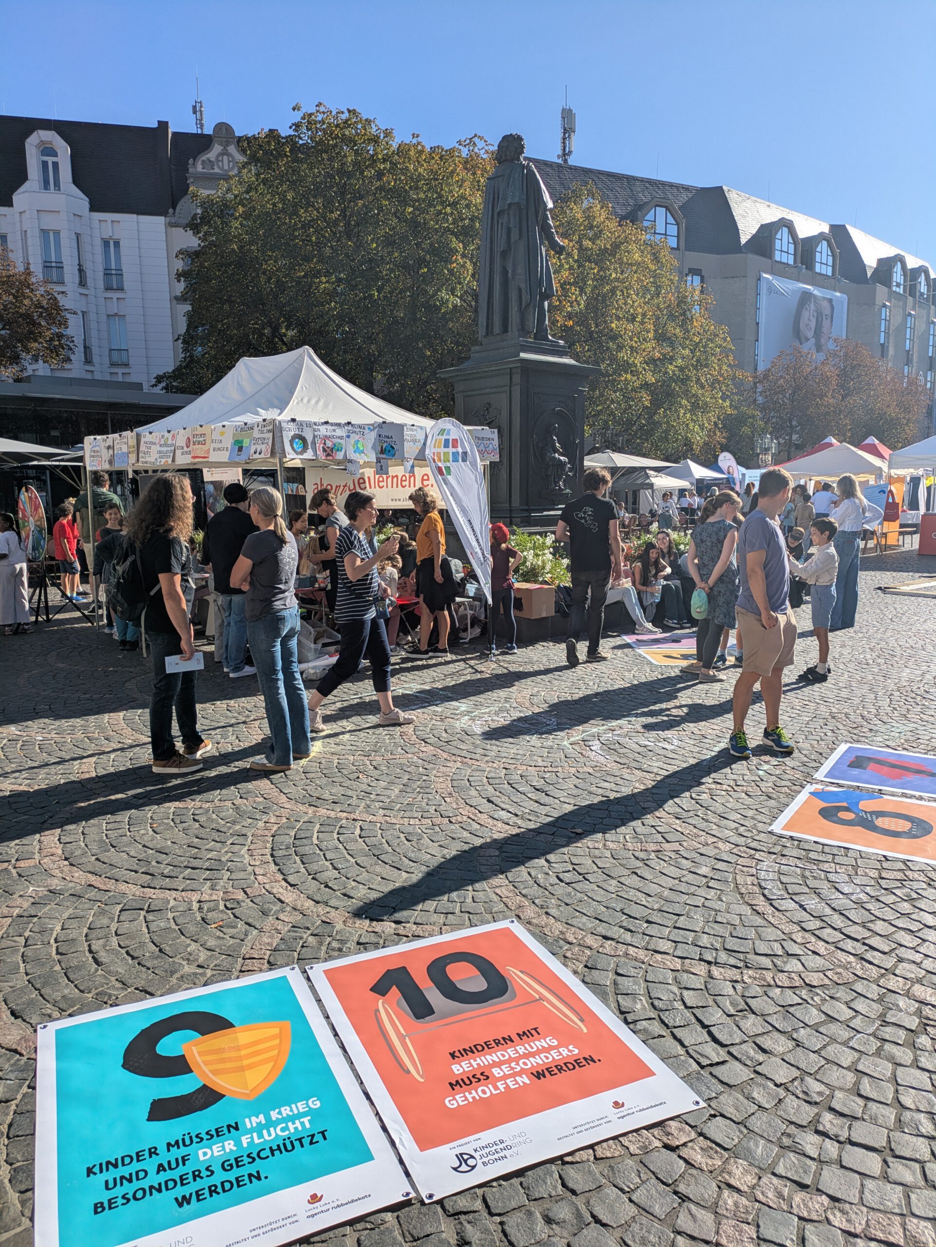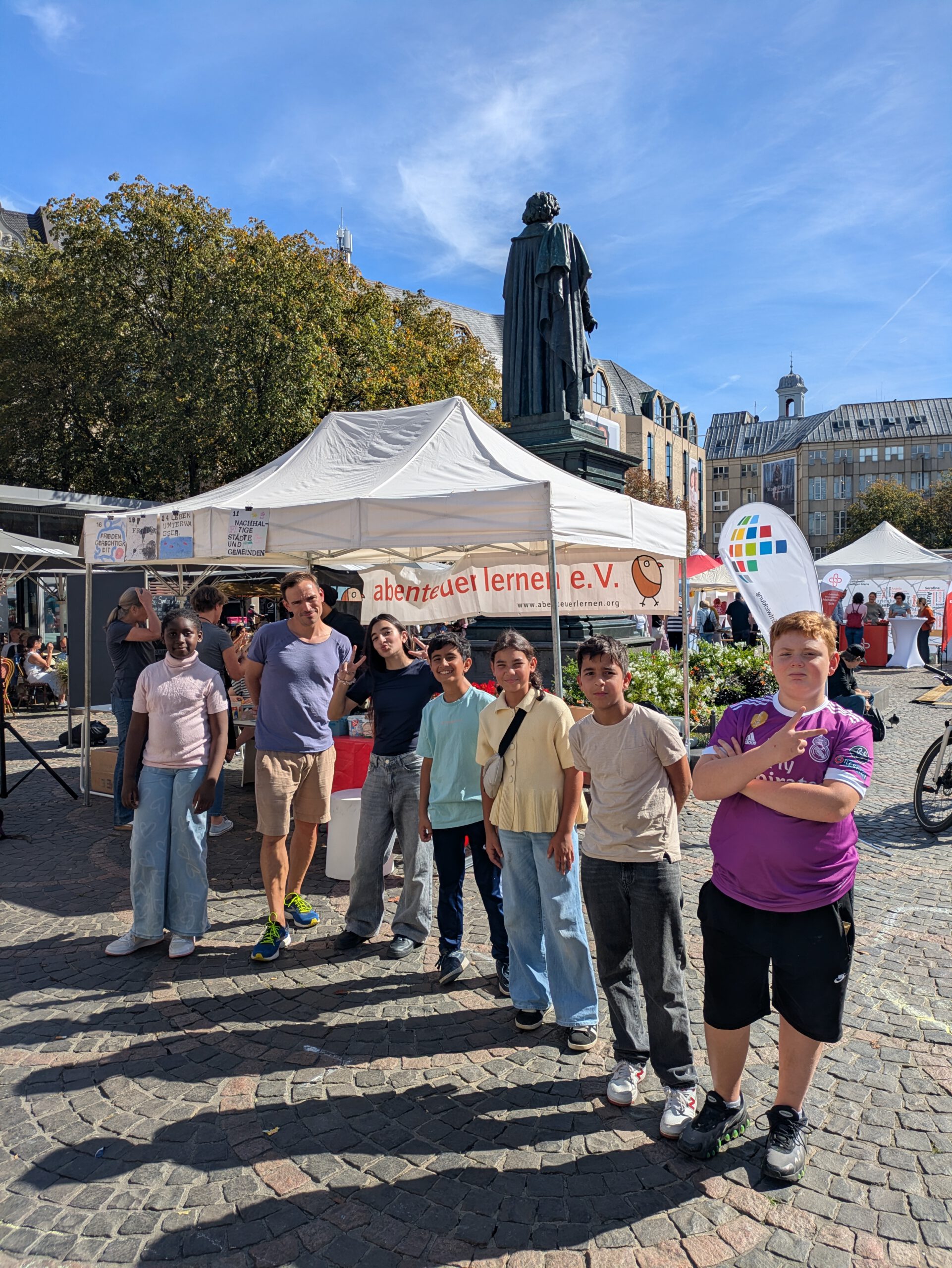 In einem zweiten Schritt wurden dann die Ergebnisse des ersten Tages der Öffentlichkeit auf dem Münsterplatz am 19.09.2025 an einem Aktionsstand näher gebracht. Die SuS sprachen dazu passierende Menschen ein und luden diese zum Mitmachen bei den verschiedenen Aktionen ein. Mit einigen Bildern zeigen wir euch heute, wie das alles aussah. Wollt ihr mehr wissen, sprecht am besten Mihemed, Layan (beide 6a), Yassin, Berfin A. (beide 6b), Kyrill oder Marie-Luise (beide 6c) an. Die erzählen euch sicher gerne von ihren Eindrücken. Begleitet wurde die Gruppe von Herrn Sciavarrello und Herrn Walker.